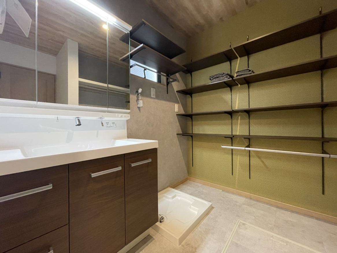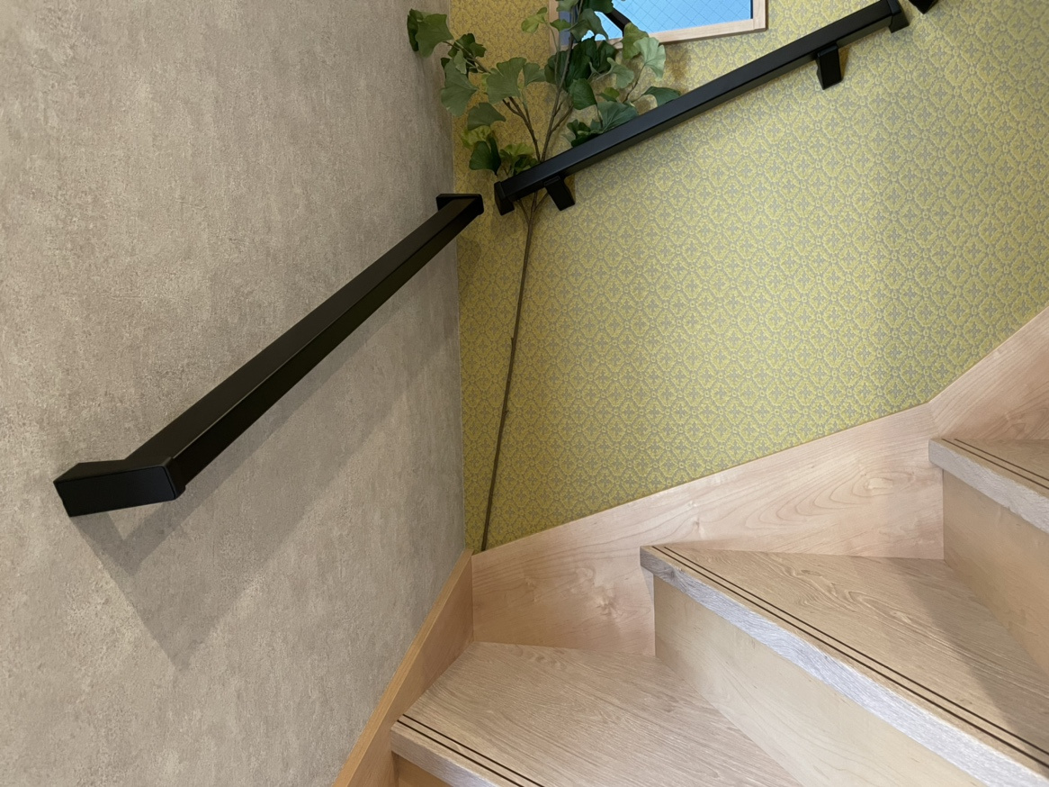 洗面やトイレや階段など、アクセントにグリーンのクロスを使用しています。