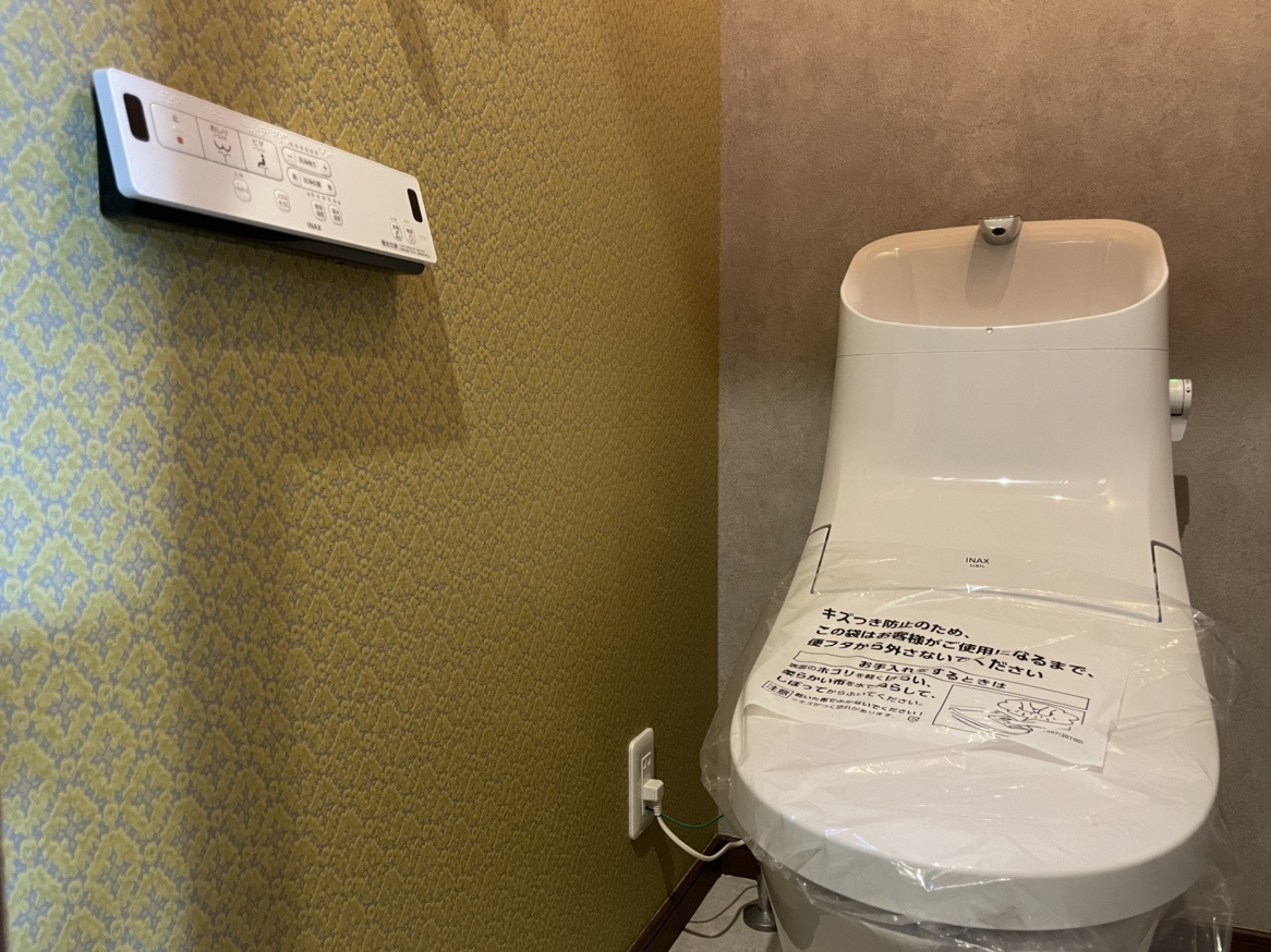タイル調の壁紙がアクセントになり、レトロな雰囲気を演出しています。