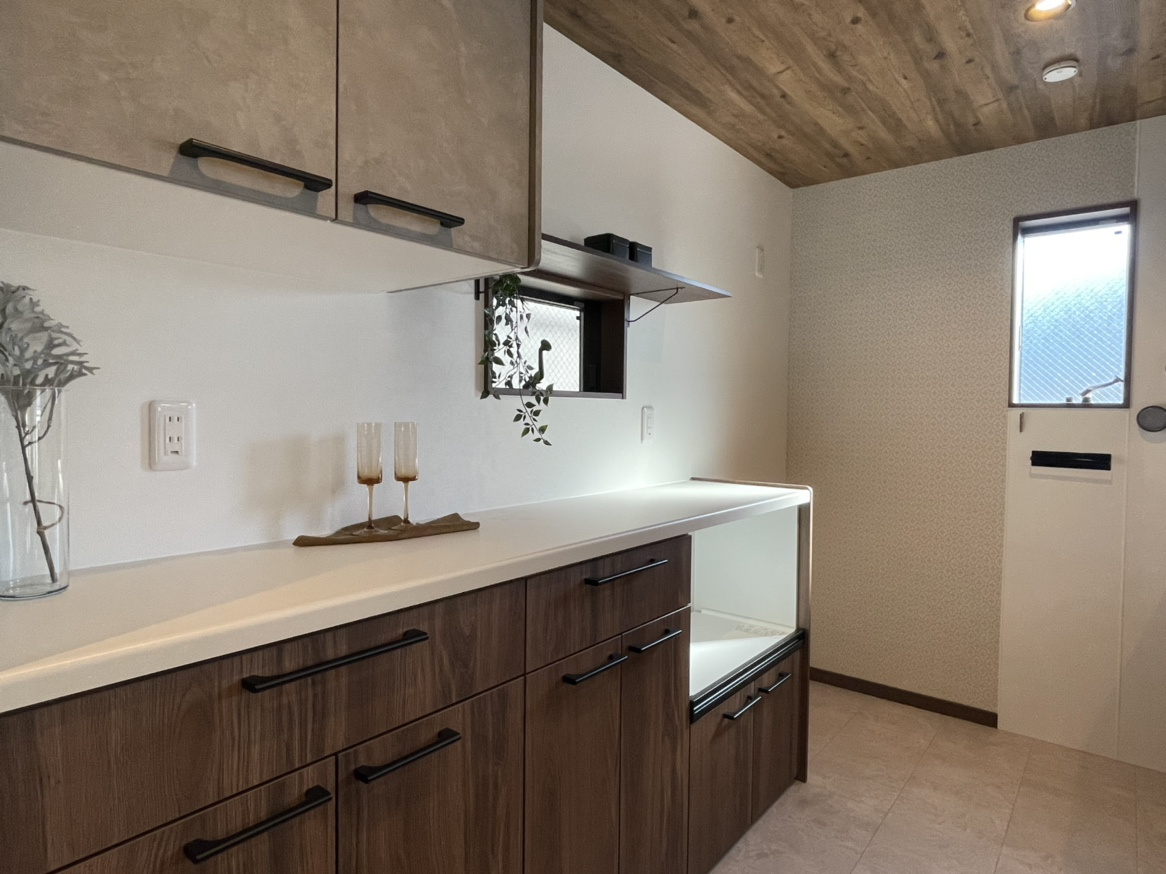 キッチン周りは木目で統一しました。