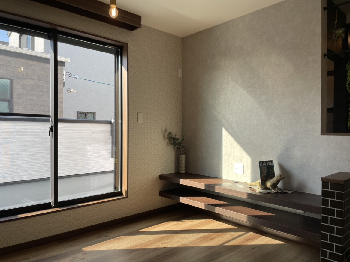 リビングには造り付け棚を設置しました。