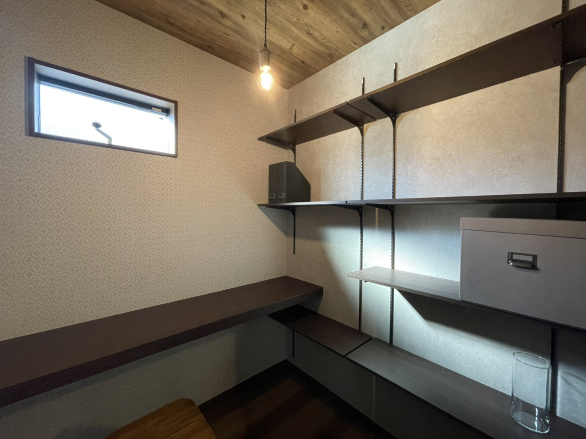 書斎スペースには棚もついていますので、書類もスッキリ片付きます。