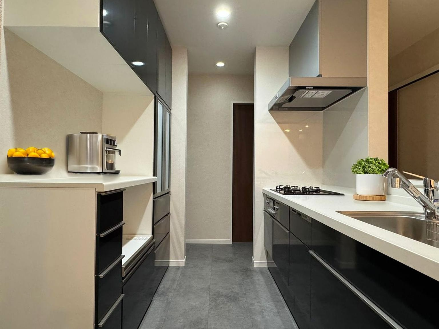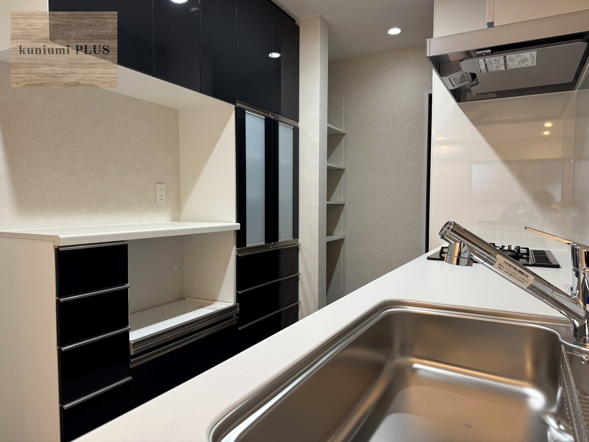 白いお部屋に映えるスタイリッシュな黒色のキッチン。