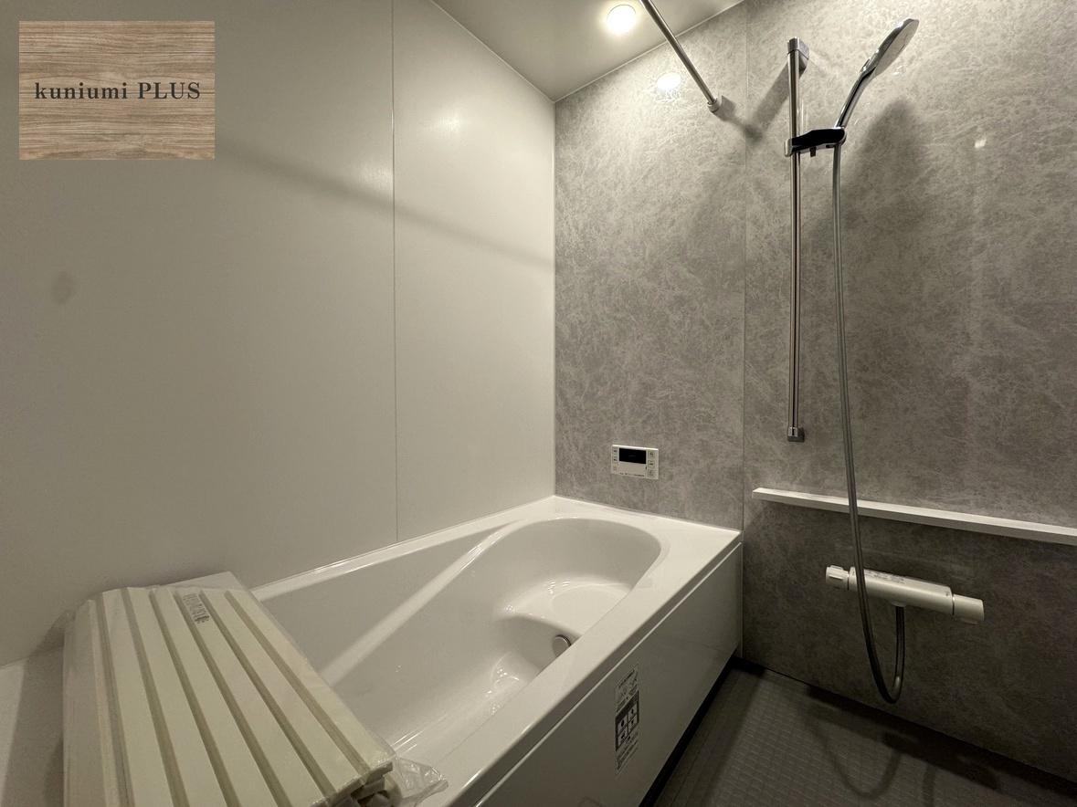 マーブル柄のアクセント壁がおしゃれな浴室。
