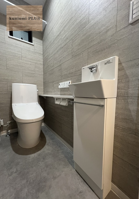 高級感のあるタイル調の壁が目を惹くトイレスペース。