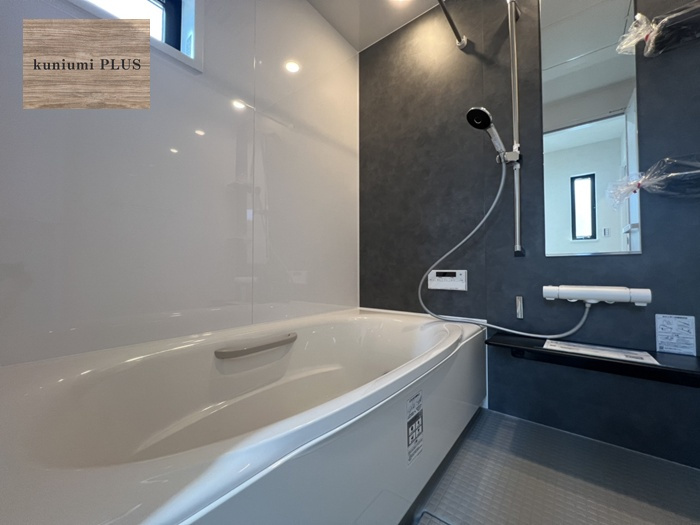 ストーン調のアクセントパネルが映えるおしゃれな浴室。