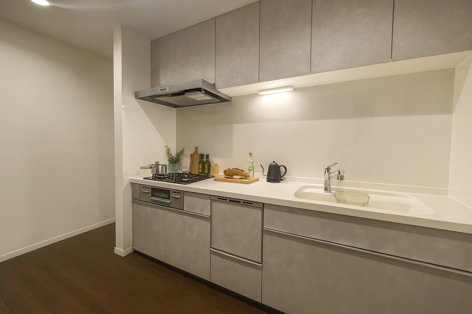 軽やかなライトグレーのキッチンは