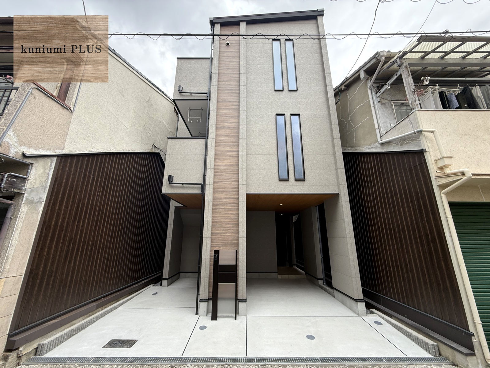 縦へと伸びるスリット窓と木目パネルを