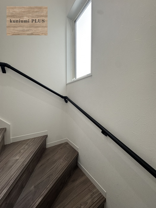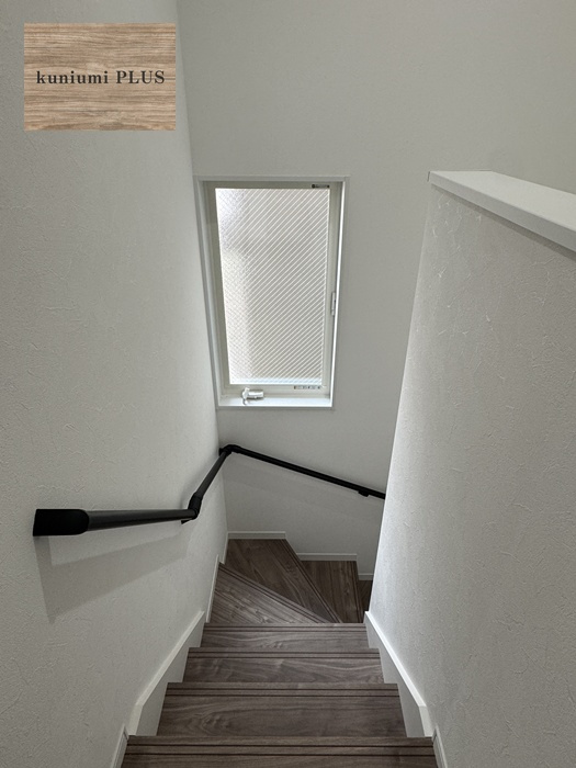 階段の途中に設けた大きな窓から
