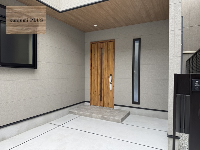 玄関まわりにあしらった木目が、