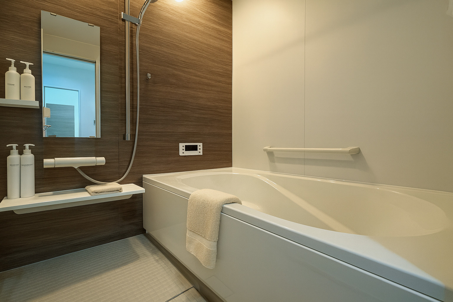 落ち着いた木目パネルが印象的な浴室は、